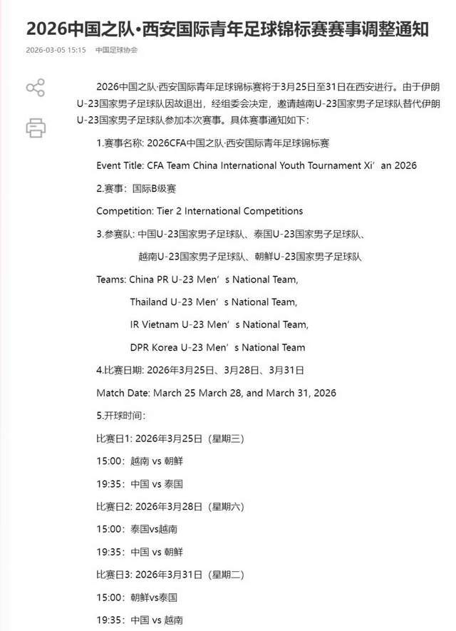 2,今天下午,伊朗U23男足宣布:原设定3月25日到3月31日,在中国西安进行的“2026中国之队·西安国际青年足球锦标赛”,伊朗U23因故退出。组委会邀请越南U23参加。