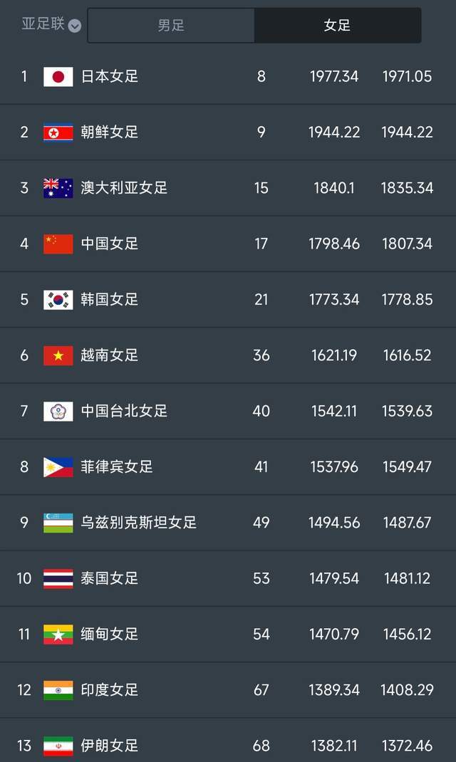 亚洲女足排名